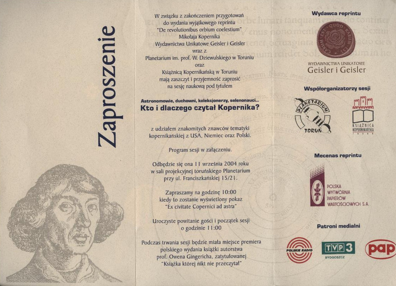 Zaproszenie na sesję naukową pod tytułem “Astronomowie, duchowni, kolekcjonerzy, selenonauci... Kto i dlaczego czytał Kopernika”, 11 września 2004 roku w sali projekcyjnej toruńskiego Planetarium.