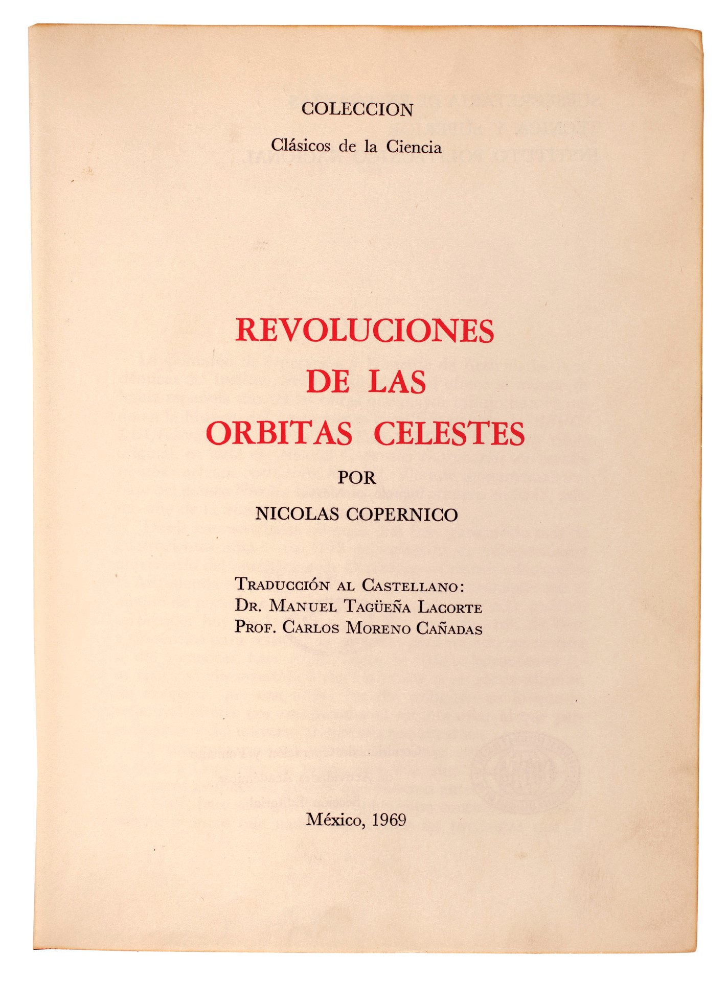 Pierwszy przekład „De revolutionibus” na język hiszpański w tłumaczeniu Manuela Tagüeňa Lacorte i Carlosa Moreno Caňadas.