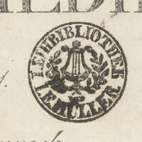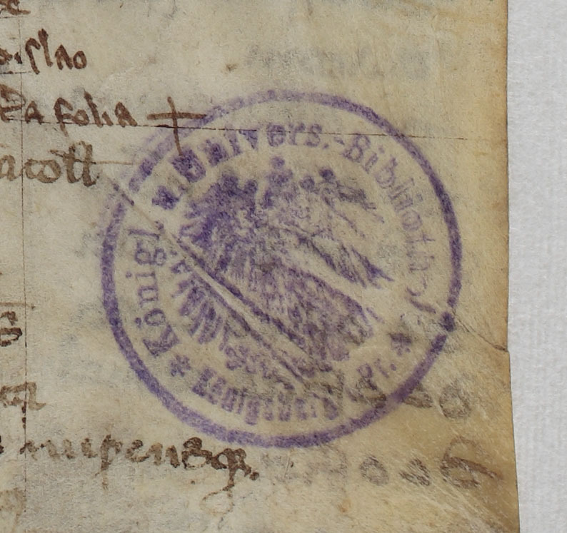 1. Pieczęć owalna Biblioteki Zamkowej: „Bibliotheca Regiomontana”;