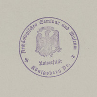 10. Pieczęć okrągła: w otoku Musikwissenschaftliches Seminar und Institut für Kirchen- und Schulmusik Universitet Königsberg (Pr) w centrum stylizowany orzeł trzymający w szponach wieniec dębowy w którego środku znajdowała się swastyka;