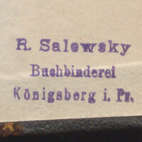 14. Pieczęć introligatora: „R. Salewsky. Buchbinderei. Königsberg i. Pr.”;