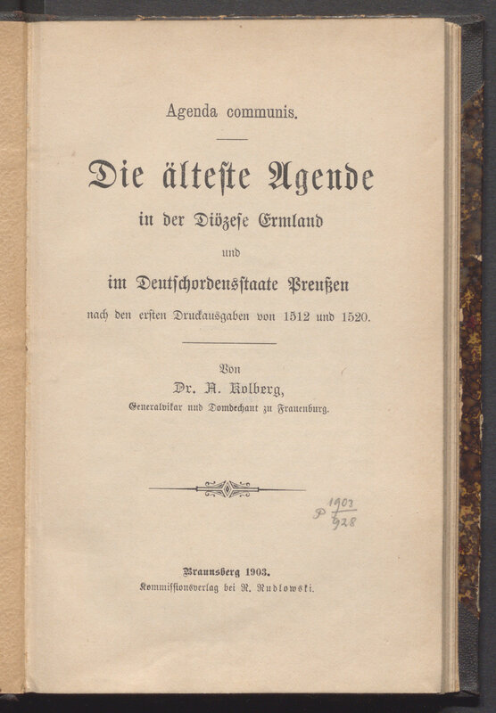 Die älteste Agende in der Diözese Ermland und Deutschordensstaate Preussen : nach den ersten Druckausgaben von 1512 und 1520 - pieczątka introligatora: R. Salewsky. Büühbinderei. Königsberg i. Pr.