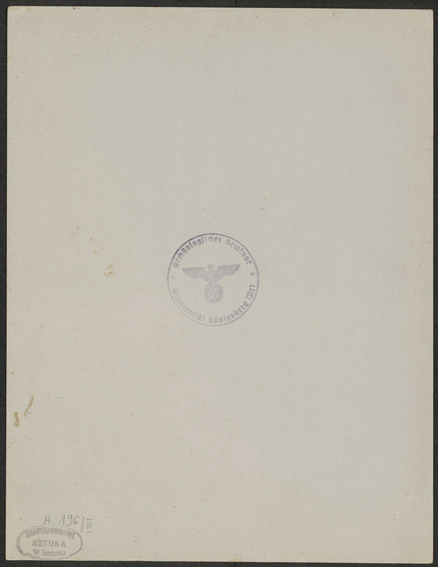 - Okrągła pieczęć na awersie tablic: Archeologisches Semminar und Museum der Albertus-Universität