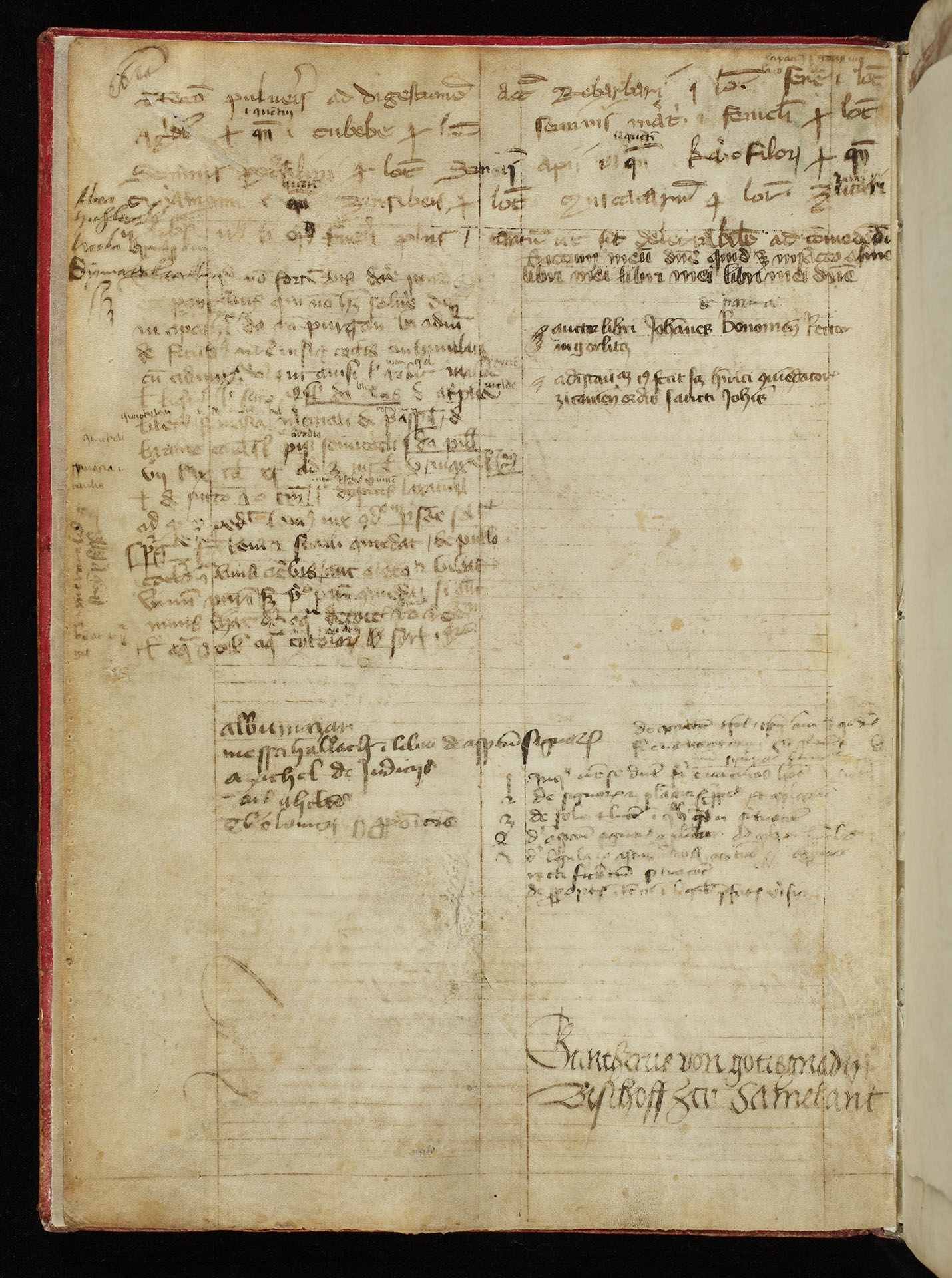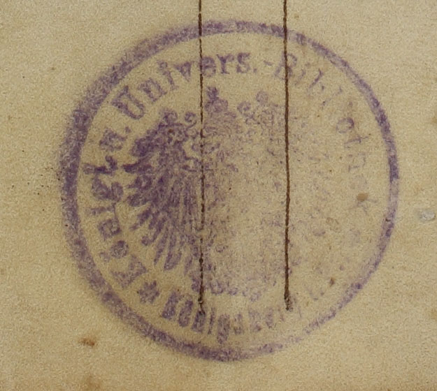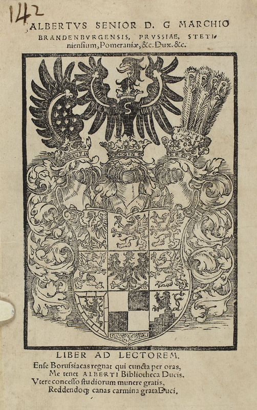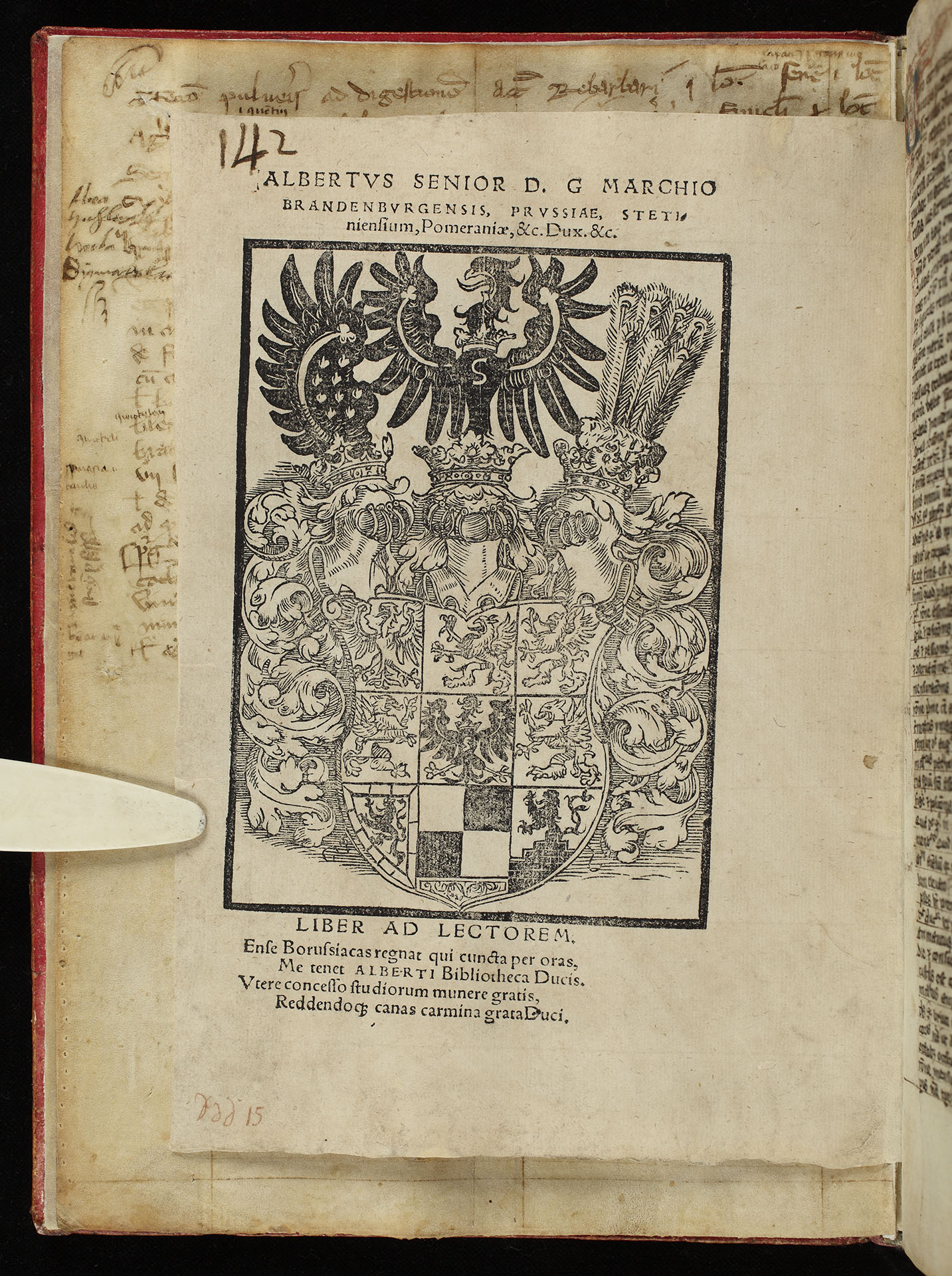 Sygnatury O.17.I. (k. 1r) oraz Ddd 15 (w lewym dolnym narożniku ekslibrisu) biblioteki zamkowej w Królewcu; sygn. 142 PiUBK (w lewym górnym narożniku); pieczęć okrągła: Königl. u. Univers. Bibliothek Königsberg i. Pr. (k. 1r); nota własnościowa: "Guntherus von Gottesgnaden bischoff zu Samelant" (k. Iv)