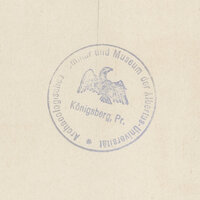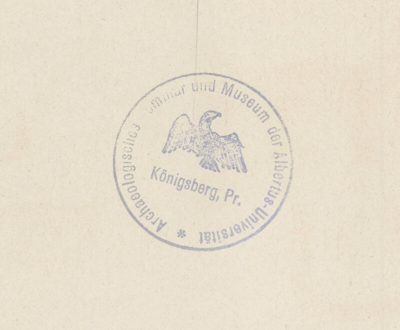 - Okrągła pieczęć na awersie tablic: Archeologisches Semminar und Museum der Albertus-Universität Königsberg, Pr.