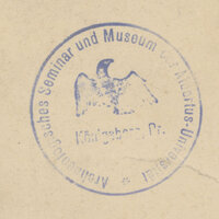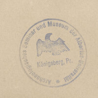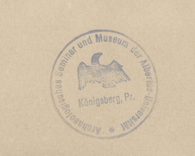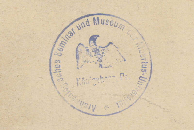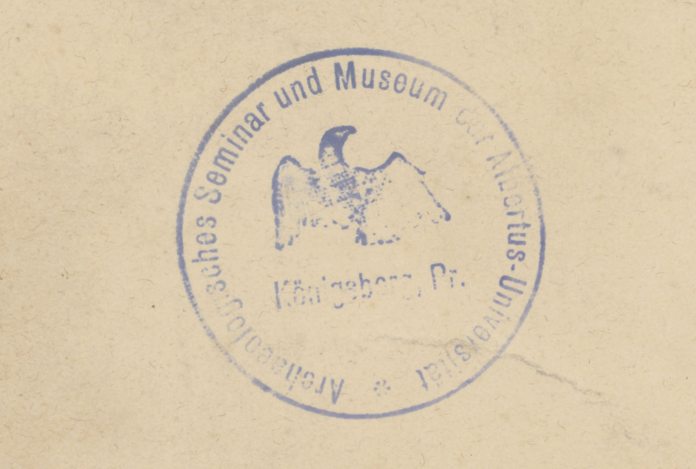 - Okrągła pieczęć na awersie tablic: Archeologisches Semminar und Museum der Albertus-Universität Königsberg, Pr.