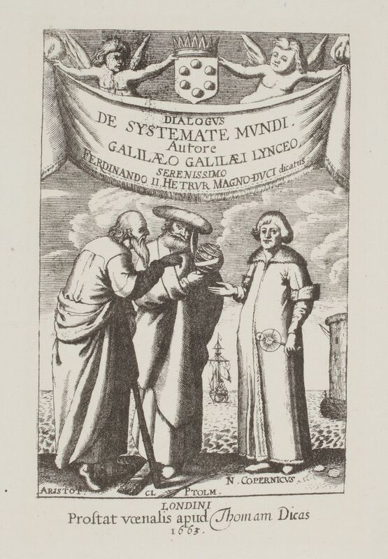 Kopernik dyskutujący z Arystotelesem i Ptolemeuszem, winieta tytułowa, rytowana przez Jacoba van der Heyden, do dzieła Galileusza: Systema cosmicum ... in quo quatuor dialogis, de duobus maximis mundi systematibus, Ptolemaico & Copernicano., London: Thomas Dicas for D. Pauli, 1663. Napisy (tytulatura): „DIALOGVS/ DE SYSTEMATE MVNDI / Autore / GALILÆO GALILÆI LYNCEO / SERENISSIMO / FERDINANDO II HETRVR MAGNO DVCI dicatus”- na wstędze nad kompozycją; „LONDINI / Prostat voenalis apud Thomam Dicas / 1663” - pod kompozycją.