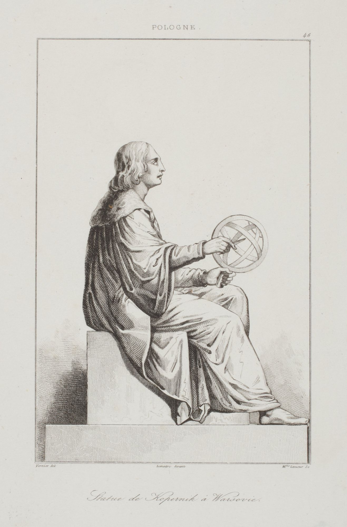 Widok warszawskiego monumentu Mikołaja Kopernika widziany z prawej strony. Astronom ujęty w pozie siedzącej z cyrklem w prawej dłoni i sferą armilarną w lewej dłoni. Rysunek nie obejmuje cokołu. W tle delikatne tło w postaci zakreskowanego pola.