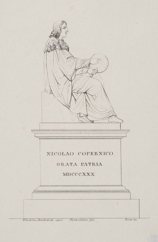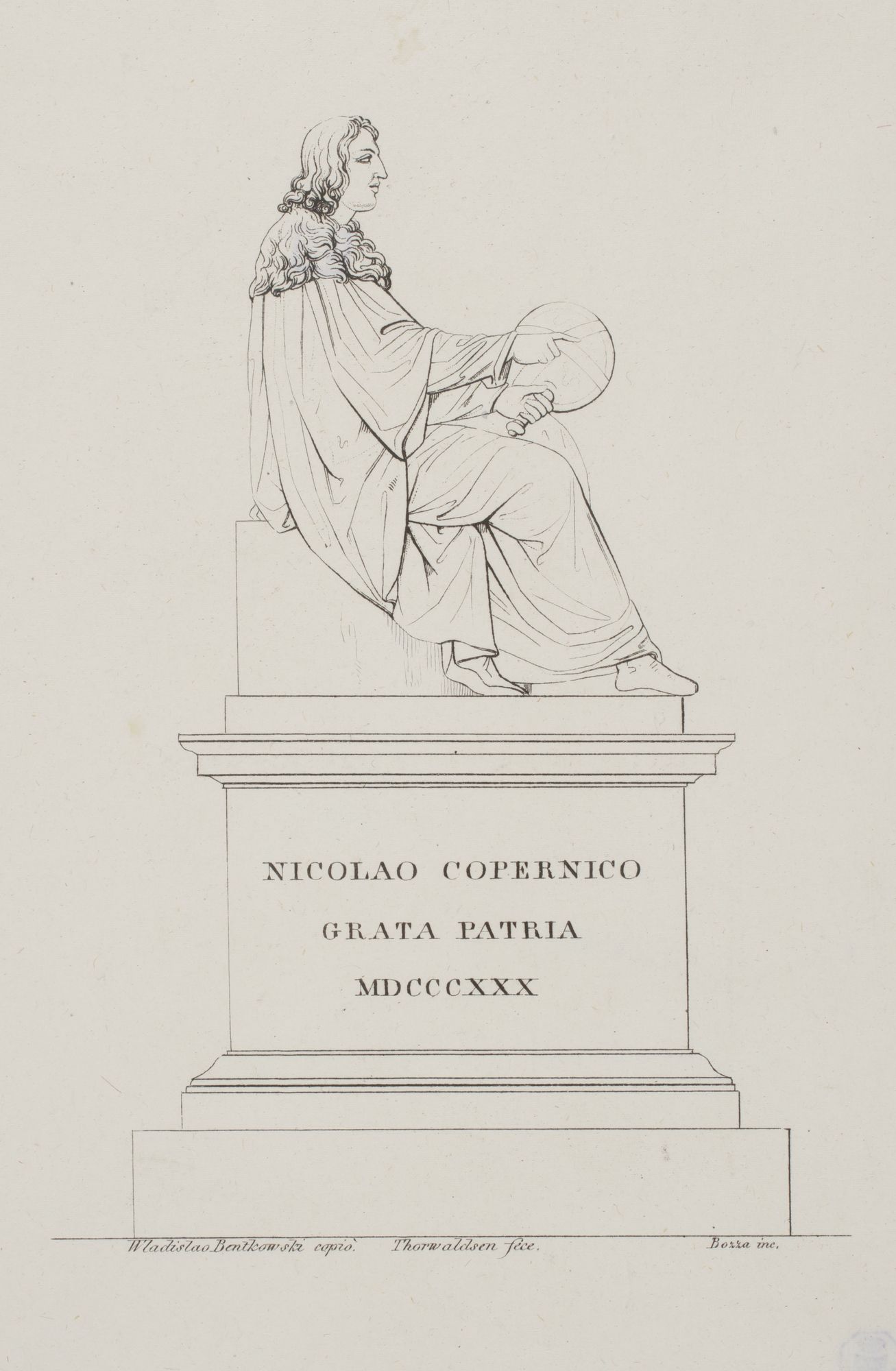 Rycina przedstawia pomnik Mikołaja Kopernika w Warszawie usytuowany przed fasadą Pałacu Staszica. Pomnik autorstwa duńskiego rzeźbiarza klasycystycznego Bertela Thorvaldsena. Odsłonięcie monumentu nastąpiło 11 maja 1830 r. Astronom siedzący na postumencie w lewej dłoni trzyma astrolabium,
