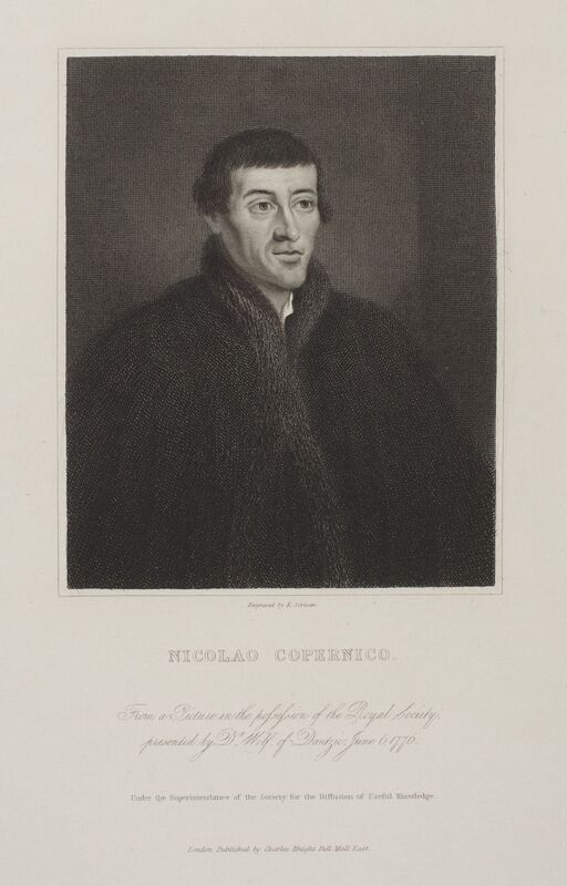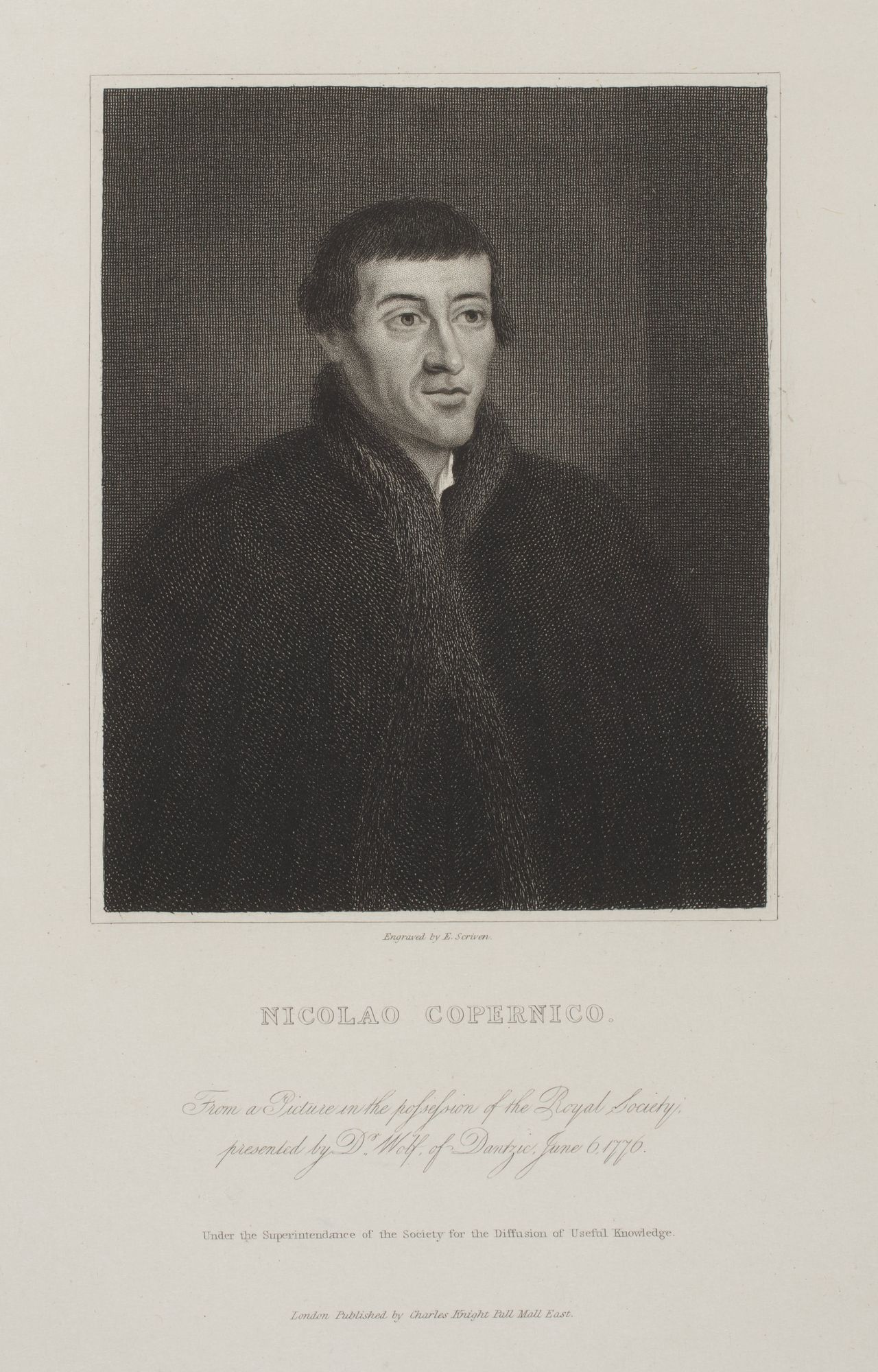 Wizerunek Mikołaja Kopernika wzorowany na obrazie ze zbiorów Towarzystwa Królewskiego w Londynie. Pierwozór namalował gdański artysta Friedrich Lohrmann, zaś dzieło podarował dla Royal Society wybitny przyrodnik, lekarz i astronom, również gdańszczanin, Mateusz Nataniel Wolf. Sygnatury: „Engraved by E. Scriven”, pod wizerunkiem uczonego „NICOLAO COPERNICO”, niżej „From the Picture in the possesion of the Royal Society / presented by dr Wolf of Dantzich June 6.1776”, poniżej „Under the uperintendance of the Society for the Diffusion of Useful Knowledge. / London Published by Charles Knight Pall Mall East”.