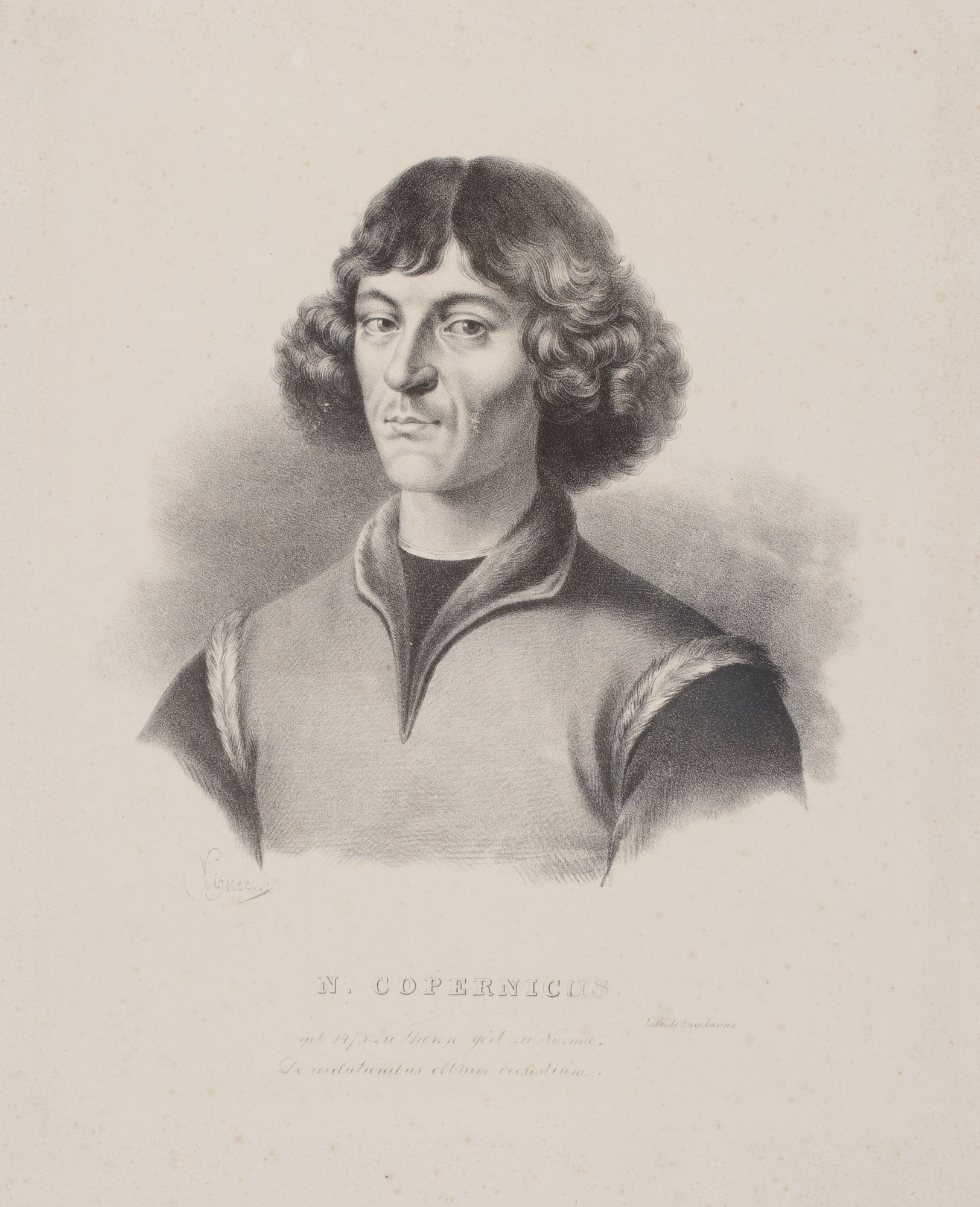 Wizerunek Mikołaja Kopernika według toruńskiego portretu astronoma z końca XVI w., przechowywanego przez lata w Gimnazjum Akademickim. Kopernik ukazany od pasa w górę, zwrócony w prawo. Litografia francuskiego rytownika Pierra Rocha Vigneron z lat trzydziestych XIX w., wykonana w zakładzie Engelmanna w Paryżu.