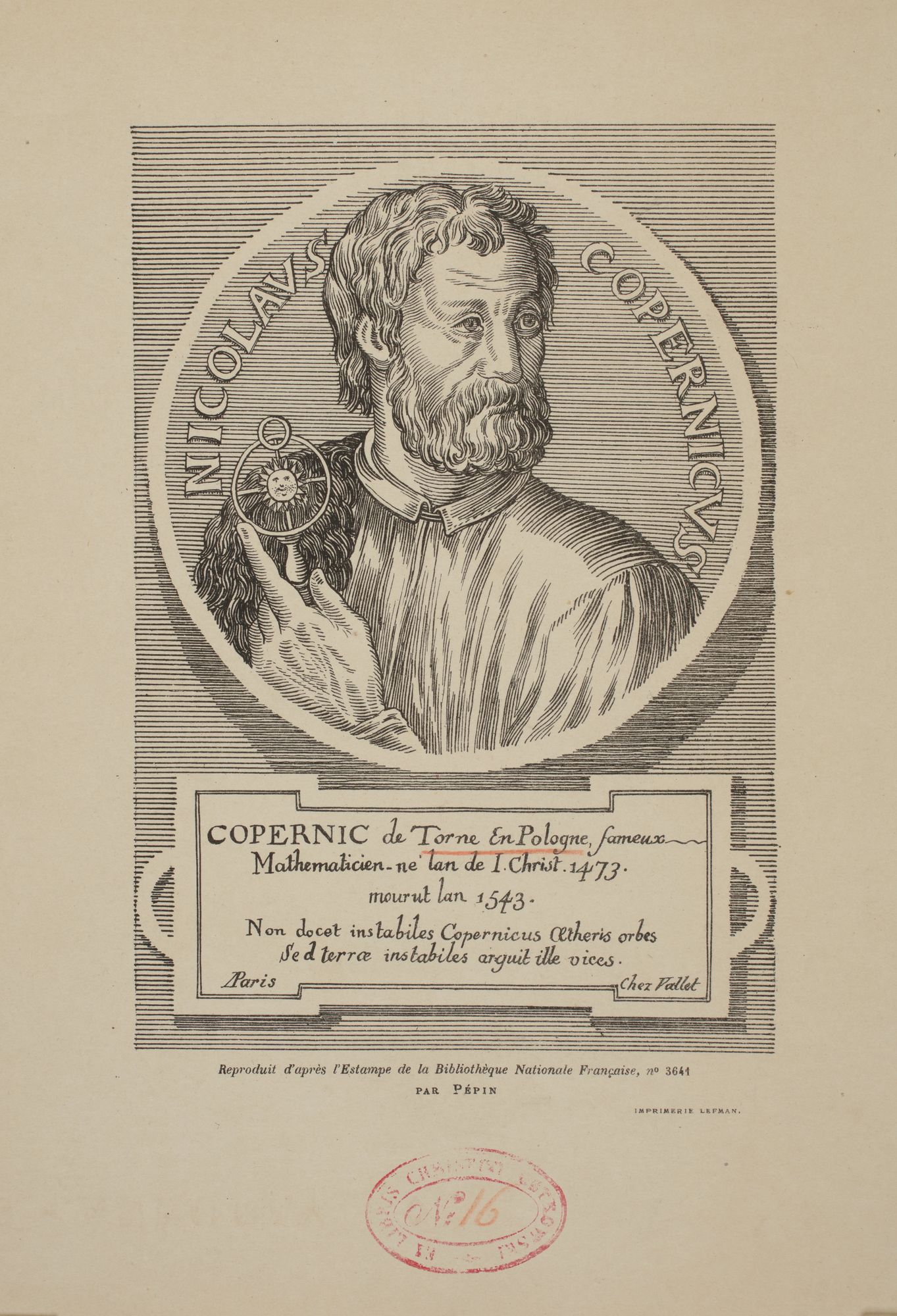 Popiersie Mikołaja Kopernika w okręgu ujęte w konwencji medalierskiej. Torso astronoma zwrócone w lewą stronę. Uczony w nietypowym wizerunku z krótko przystrzyżonymi włosami, brodą i wąsami. W lewej ręce trzyma model systemu heliocentrycznego. Wokół napis „NICOLAVS COPERNICVS”. Napisy: pod wizerunkiem napis ujęty w ramkę: „Copernic de Torne En Pologne, fameux Mathematicien-ne lan de