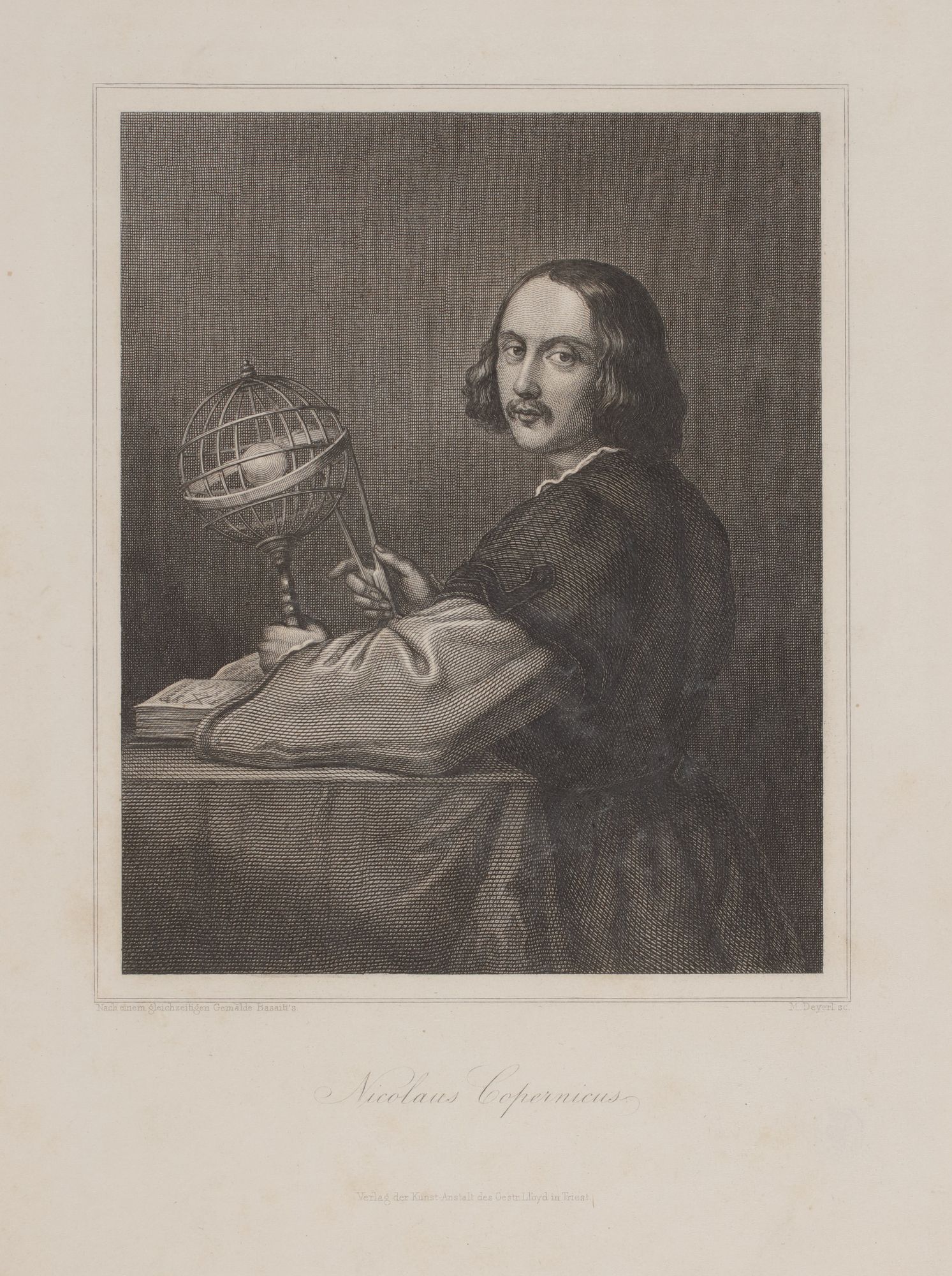 Rycina powielająca domniemany wizerunek Mikołaja Kopernika z obrazu olejnego z lwowskiej kolekcji Lubomirskich przypisywany Marco Basaitiemu, włoskiemu mistrzowi doby renesansu. Data 1512
