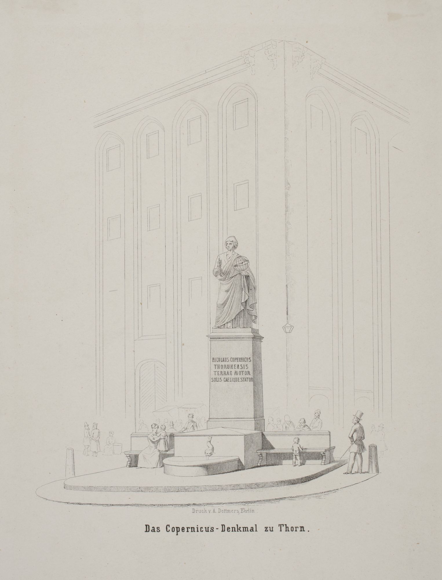 Toruński pomnik Mikołaja Kopernika przedstawiony na tle południowo-wschodniego narożnika Ratusza Staromiejskiego w Toruniu. Na ławce, z lewej strony, kobieta z dzieckiem. Z prawej strony mężczyzna z laską. Za pomnikiem, delikatnie przedstawiona, grupa mieszczan. Napisy: „Druck v A. Dettmers, Berlin Das Copernicus Denkmal zu Thorn” (Pomnik Kopernika w Toruniu) – na osi, pod rysunkiem.