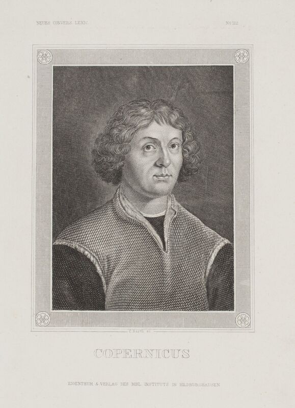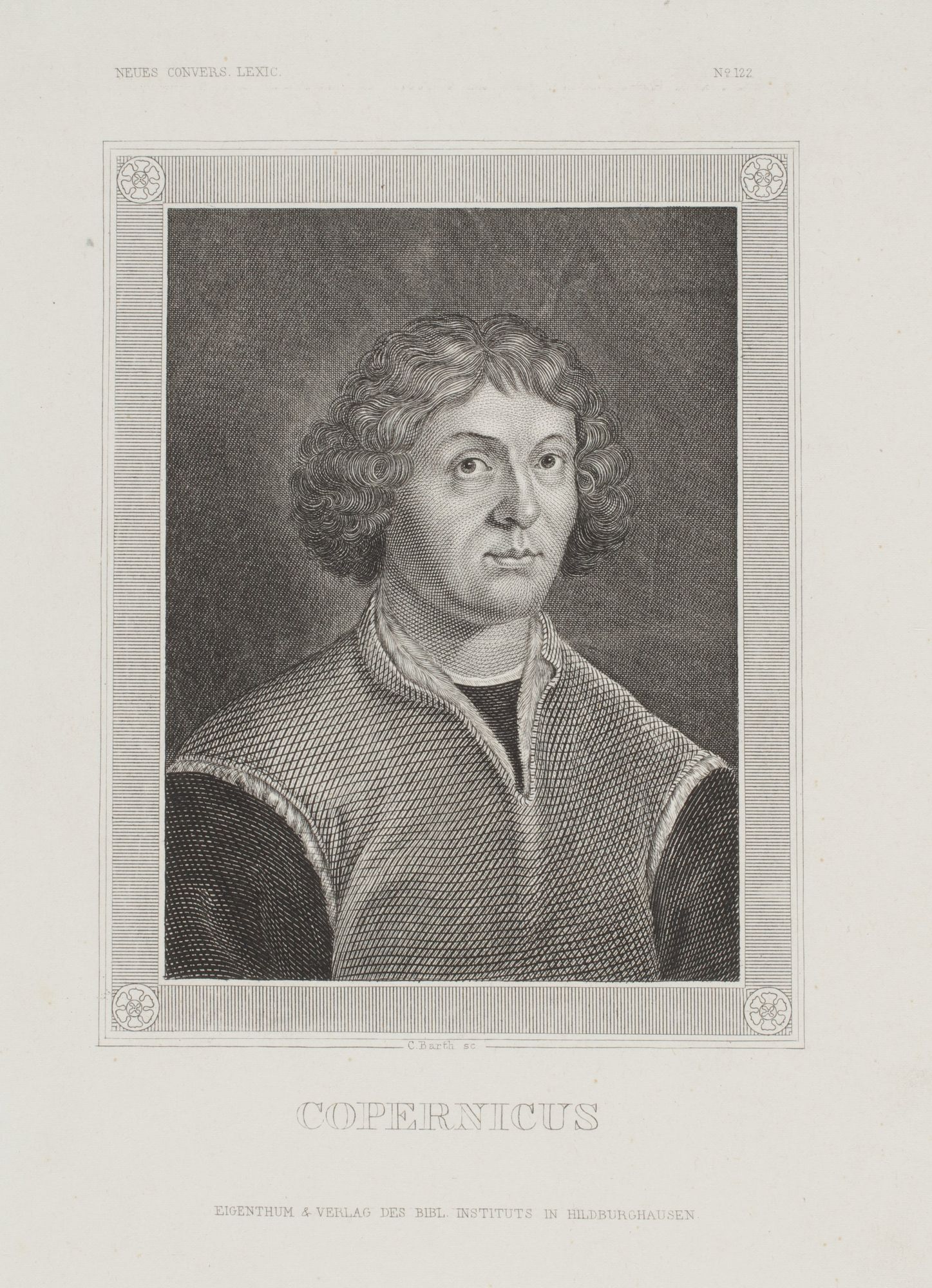 Rycina pochodzi z niemieckiej encyklopedii MEYERS CONVERSATIONS LEXICON wydawanej w latach 1839–1855 przez wydawnictwo Josepha Meyera (1796–1856) Eigenthum & Verlag des Bibl[iographischen] Instituts in Hildburghausen : Meyer J. „Neues Conversations Lexicon, Hildburghausen, V.2, 1855, s. 446. Popiersie zwrócone w prawo, w prostokątnej ramie z rozetami w narożach. Napisy: u dołu: „COPERNICUS”. U góry: „NEUES CONVERS. LEXIC. Nr 122”. Sygn.: „C[arl] Barth sc.[ulpsit]”.