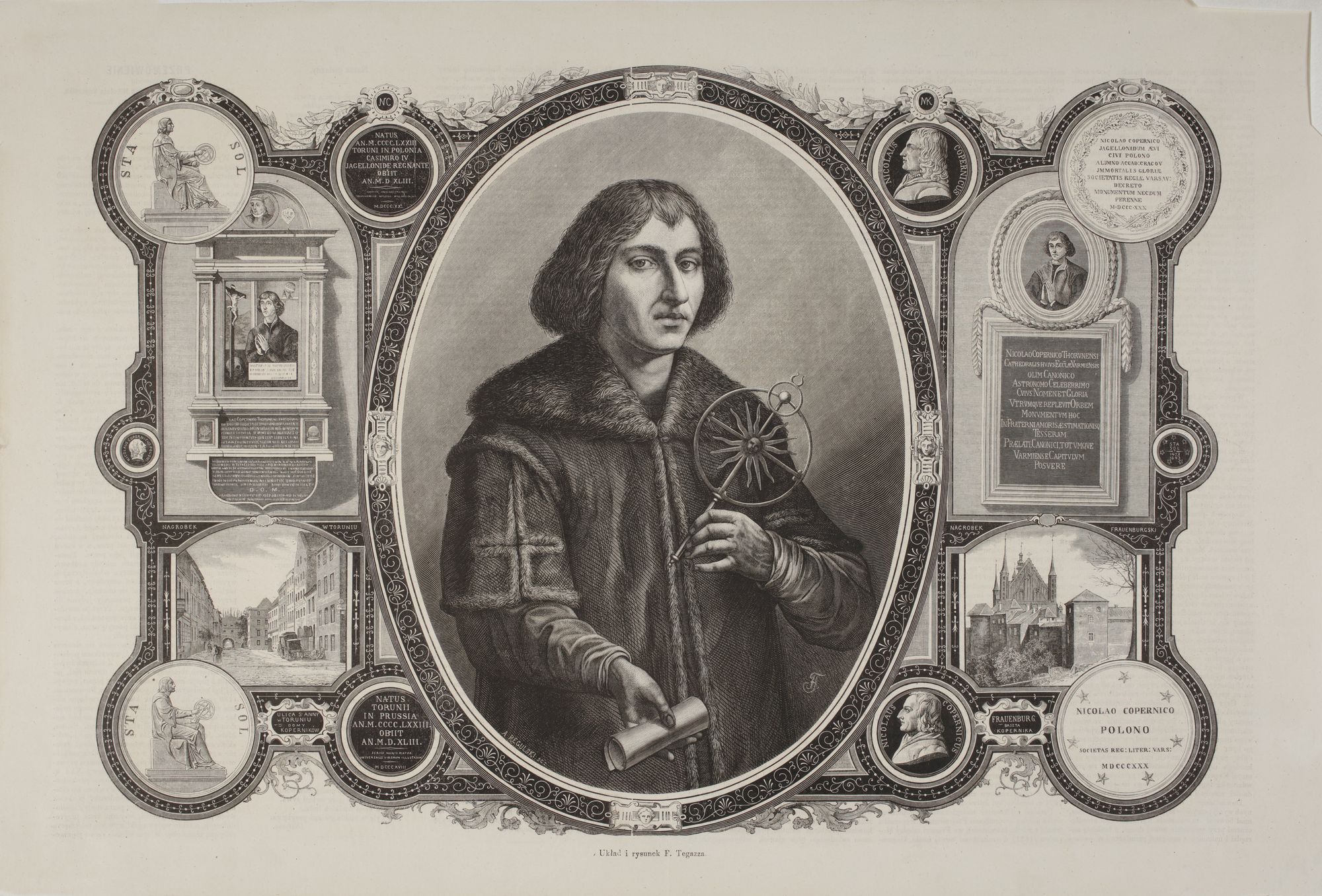 Bogata kompozycja dedykowana pamięci Mikołaja Kopernika związana z jubileuszem 400. rocznicy urodzin astronoma w 1873 r. W partii centralnej, w owalu, reprodukcja obrazu przypisywanego Ghirlandaio (Ridolfi di Domenico) w opracowaniu Franciszka Tegazzo. W rogach kilka medali pamiątkowych. Ponadto portrety i tablice z nagrobków w Toruniu (z lewej) i Fromborku (z prawej). Widoki miejsc związanych z uczonym, uznawana w XIX w. za dom urodzin Kopernika kamienica na rogu ul. Św. Anny i Piekary (z lewej) oraz Baszta Kopernika we Fromborku (z prawej). Napisy: „A REGULSKI S.C.” – w lewej dolnej części portretu (sygnatura rytownika); „FT.” – w prawej dolnej części (monogram autora rysunku); „Układ i rysunek F. Tegazza” - pod kompozycją.