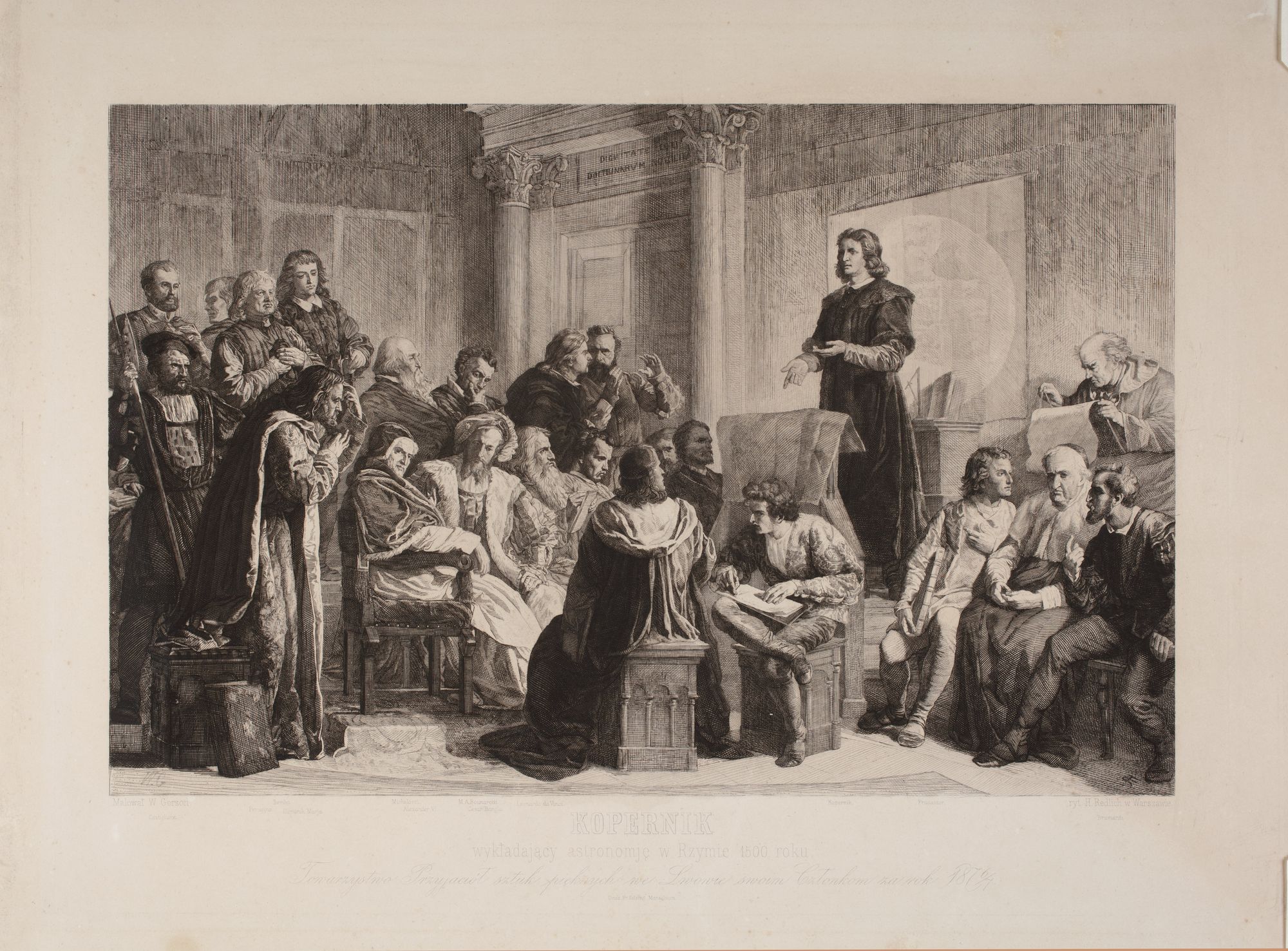 Egzemplarz wycięty z gazety, na odwrociu notka o śmierci założyciela i wydawcy Tygodnika Ilustrowanego Józefa Ungera. Grafika Gorazdowskiego jest kolejną wersją, obok ryciny Redlicha, wzorowanych na obrazie Wojciecha Gersona: „Wykład Mikołaja Kopernika w Rzymie”. W wersji Gorazdowskiego w dolnej