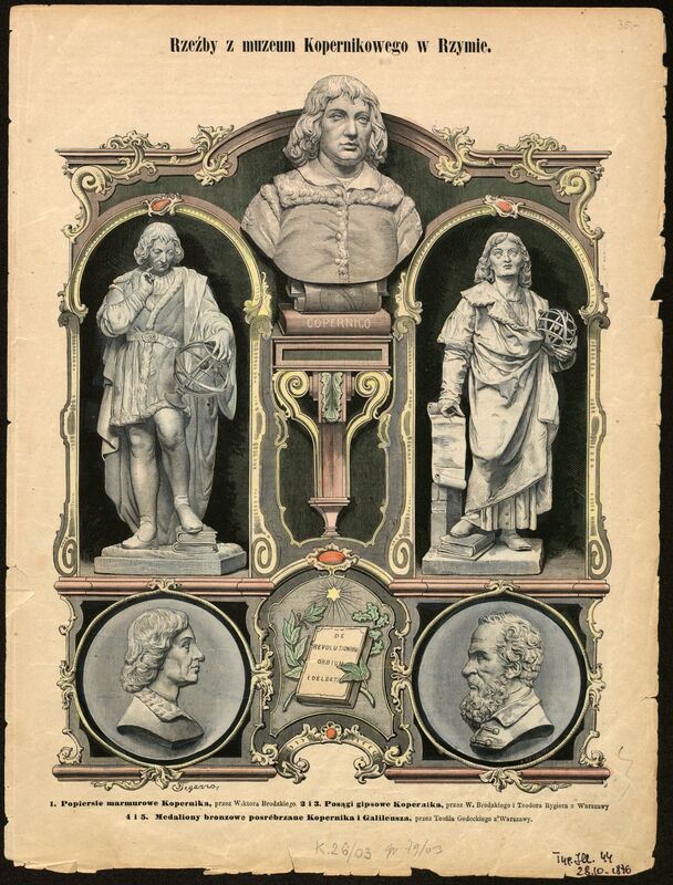 Na rycinie przedstawione zostały dwa posągi i popiersie Mikołaja Kopernika oraz medaliony z popiersiami Kopernika i Galileusza, pomiędzy którymi widnieje najważniejsze dzieło Mikołaja Kopernika: De revolutionibus orbium coelestium – zawierające wykład heliocentrycznej i heliostatycznej budowy wszechświata. Głównym założycielem Muzeum Kopernika przy Uniwersytecie Rzymskim, w którym znajdują się wspomniane rzeźby, był polski historyk emigracyjny, Artur Wołyński (1844–1893). Pomysłodawcą stworzenia muzeum przy okazji 400. rocznicy urodzin Kopernika był profesor filozofii Domenico Berti (1820–1897), włoski eseista, polityk i naukowiec, wówczas były minister oświaty i członek parlamentu włoskiego. Celem muzeum
