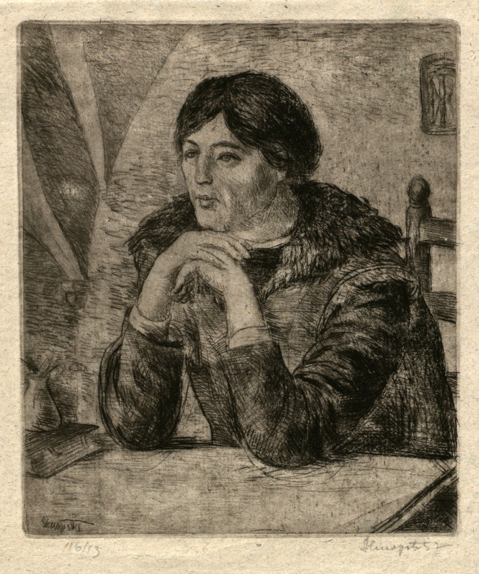 Portret Mikołaja Kopernika siedzącego przy stole, podpierającego dłońmi podbródek. Wykonanie techniką suchej igły przez Hieronima Skurpskiego, artystę malarza, grafika, rysownika, historyka sztuki, muzealnika i działacza kultury, założyciela i pierwszego dyrektora Muzeum Warmii i Mazur w Olsztynie.