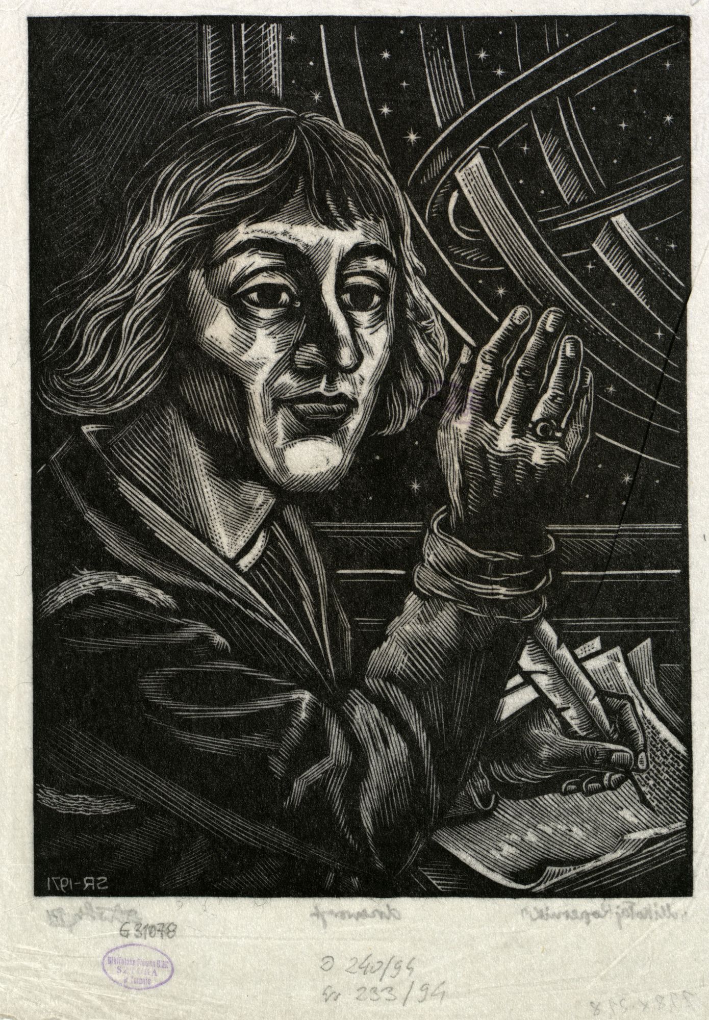 Astronom, w półpostaci profilem w prawo, głowa zwrócona w prawo, siedzący przy pulpicie, podtrzymuje prawą dłonią astrolabium, w lewej dłoni trzyma gęsie pióro pisząc na kartkach papieru.