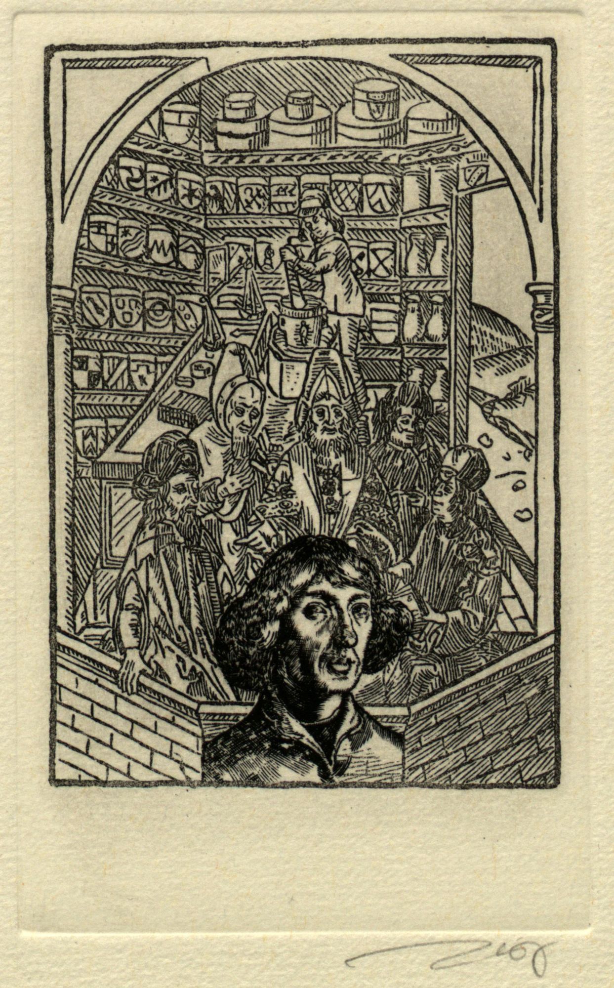 Postać astronoma, według rysunku Tobiasa Stimmera z 1587 r., popiersie zwrócone w prawo, na tle dysputujących uczonych w renesansowej pracowni. Autorem prac jest Zbigniew Janeczek, grafik, wydawca. Urodzony w Łodzi, gdzie studiował i prowadził działalność artystyczną. Początkowo tworzył małe formy graficzne, głównie ekslibrisy. Od lat zajmuje się ilustrowaniem książek.